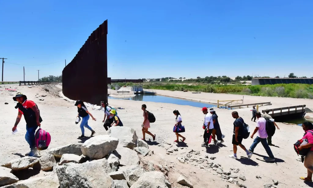 Migrants cross into the US from the Mexico through a gap in the border wall separating the Mexican town of Algodones from Yuma, Arizona, on 16 May. Photograph: Frederic J Brown/AFP/Getty Images