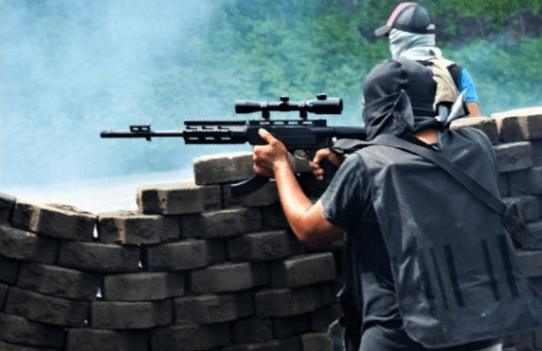 Opposition sniper firing from behind a roadblock in 2018. Photo by opposition activist Carl David Goette-Luciak.