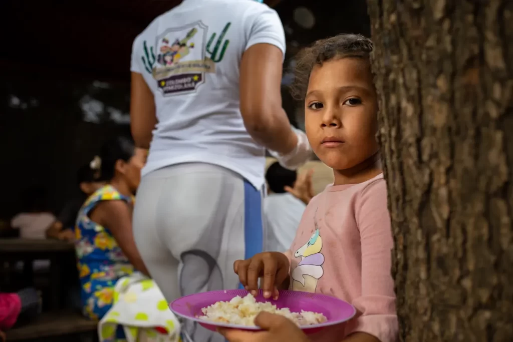 A young girl in La Pista eats a meal provided by an NGO. Photograph: Anton Alexander Lopez/The Guardian
