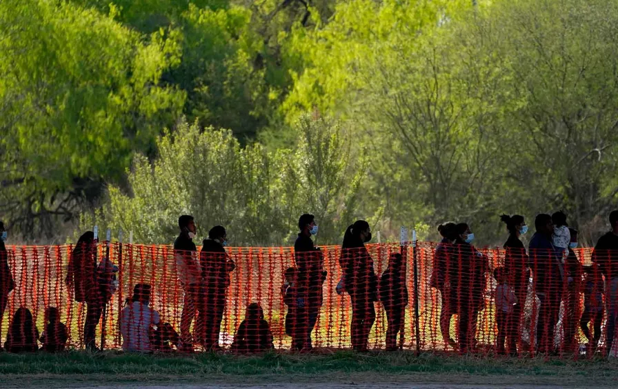 Migrants in custody at a US Customs and Border Protection processing area under the Anzalduas International Bridge, in Mission, Tex. (Julio Cortez / AP Photo)